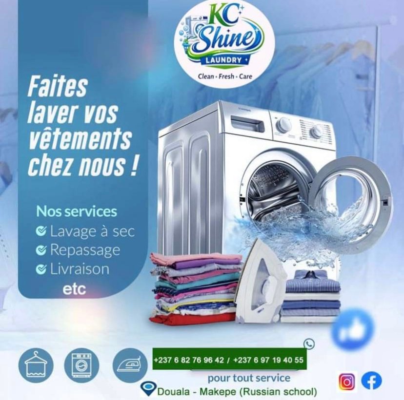Faites laver vos vêtements chez nous ! Nos services ~ Lavage à sec… ~ Repassage… ~ Livraison. etc.. Clean • Fresh • Care +237 6 82 76 96 42 / +237 6 97 19 40 55 pour tout service Douala – Makepe (Russian school)