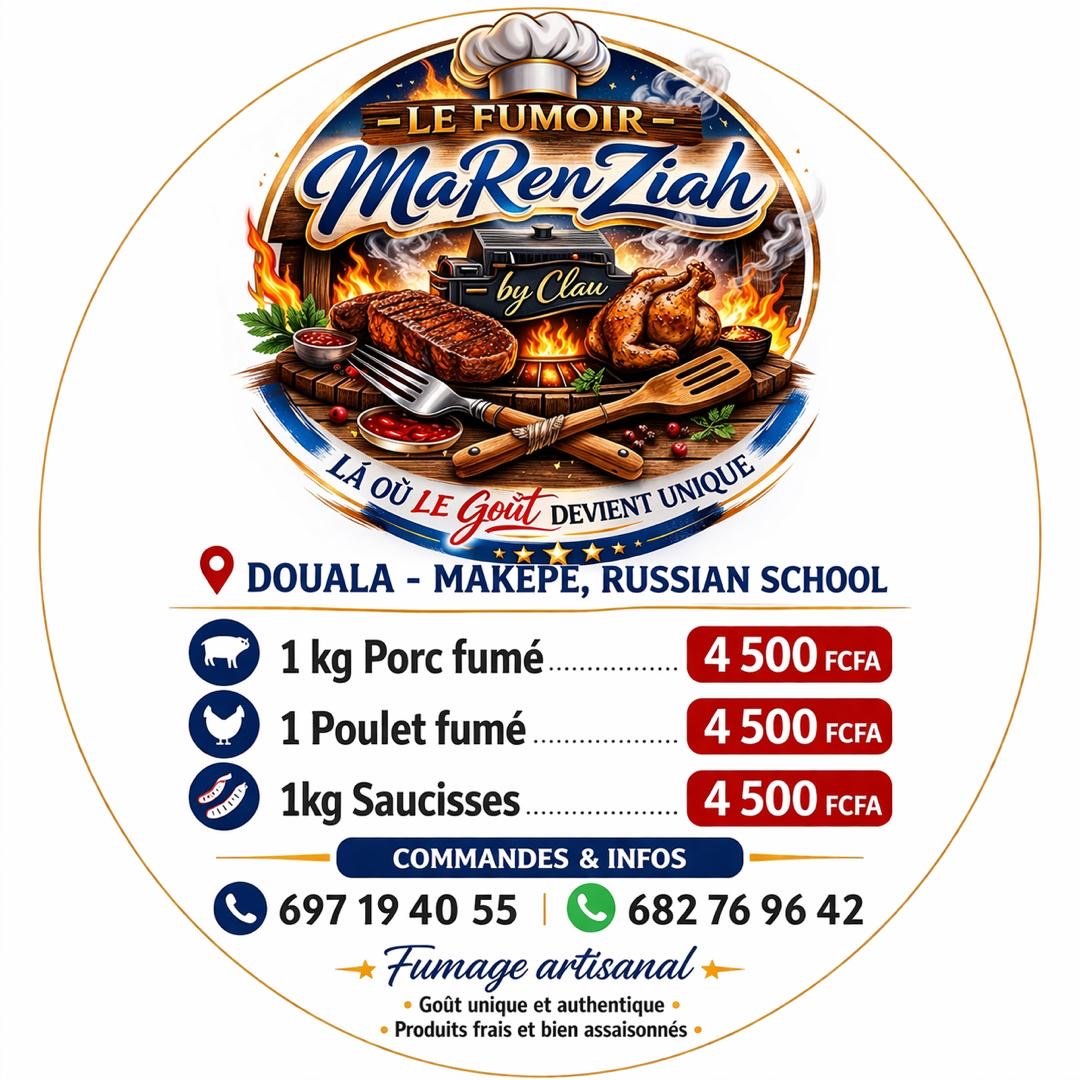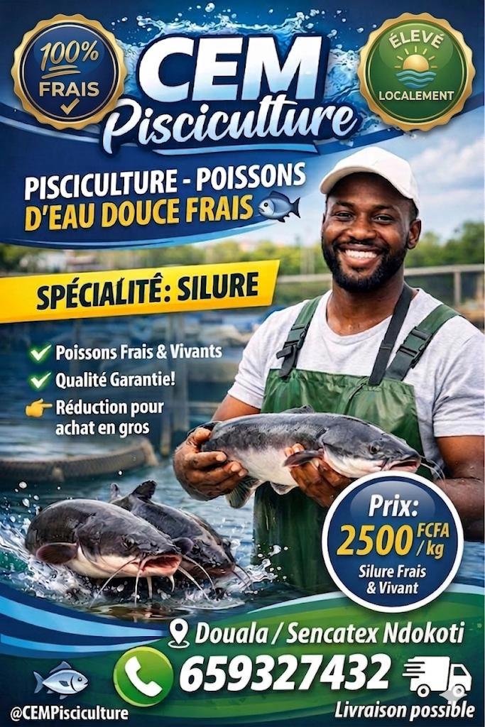 1 Poulet fumé – 4500 FCFA Saucisses – 4500 FCFA COMMANDES & INFOS : ~ Fumage artisanal ~ Goût unique et authentique ~ Produits frais et bien assaisonnés ……………………………………….. PISCICULTURE – POISSONS D’EAU DOUCE FRAIS SPÉCIALITÉ: SILURE Poissons Frais & V...