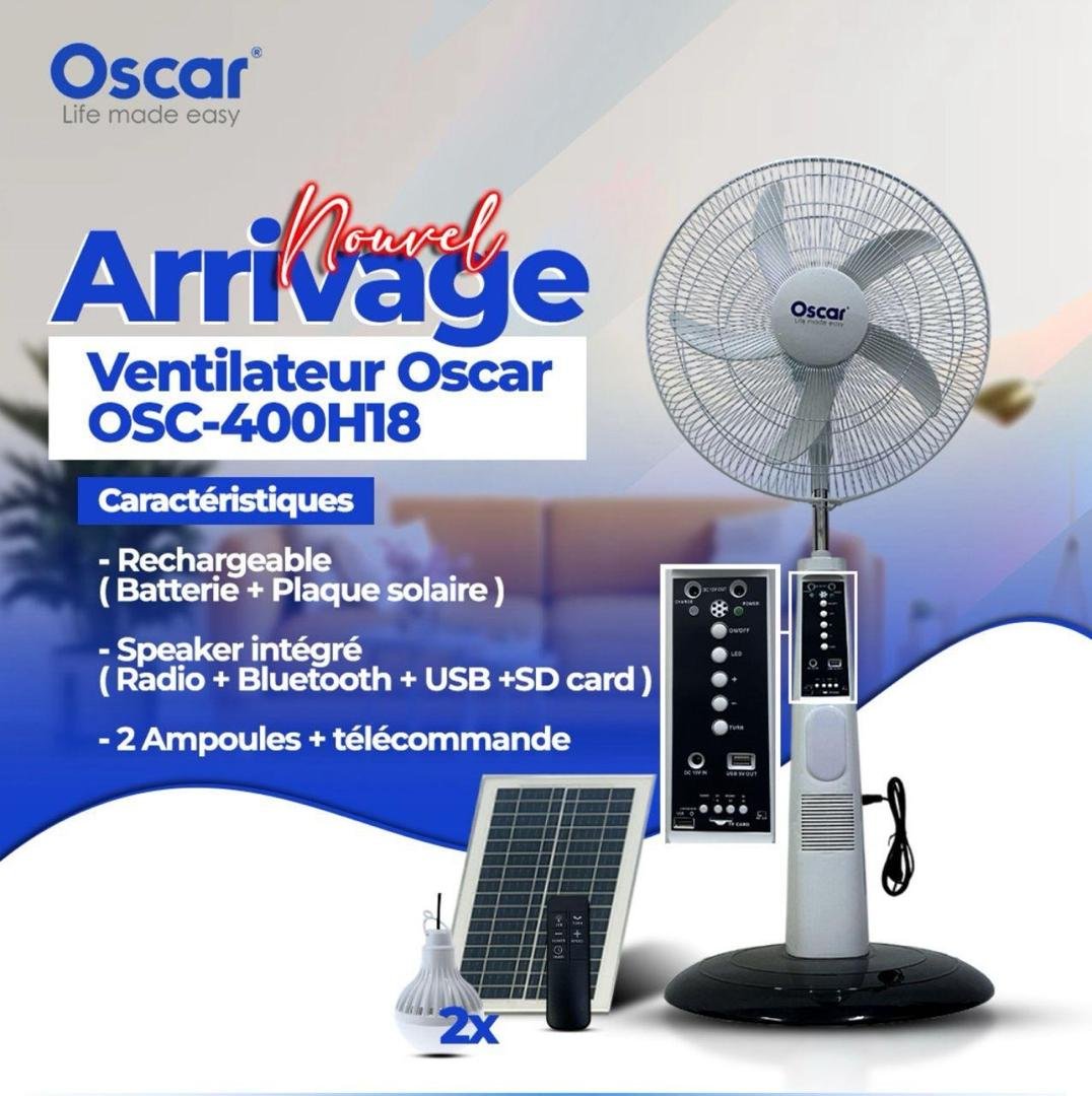 Ventilateur rechargeable oscar 18pouces avec plaque solaire, ampoules led, télécommande et Bluetooth speaker intégré pour jouer de la musique...